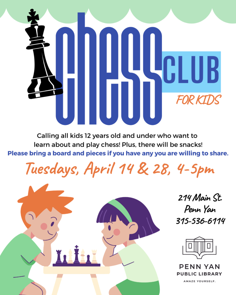 Calling all kids 12 years old and under who want to learn about and play chess! Plus, there will be snacks!
