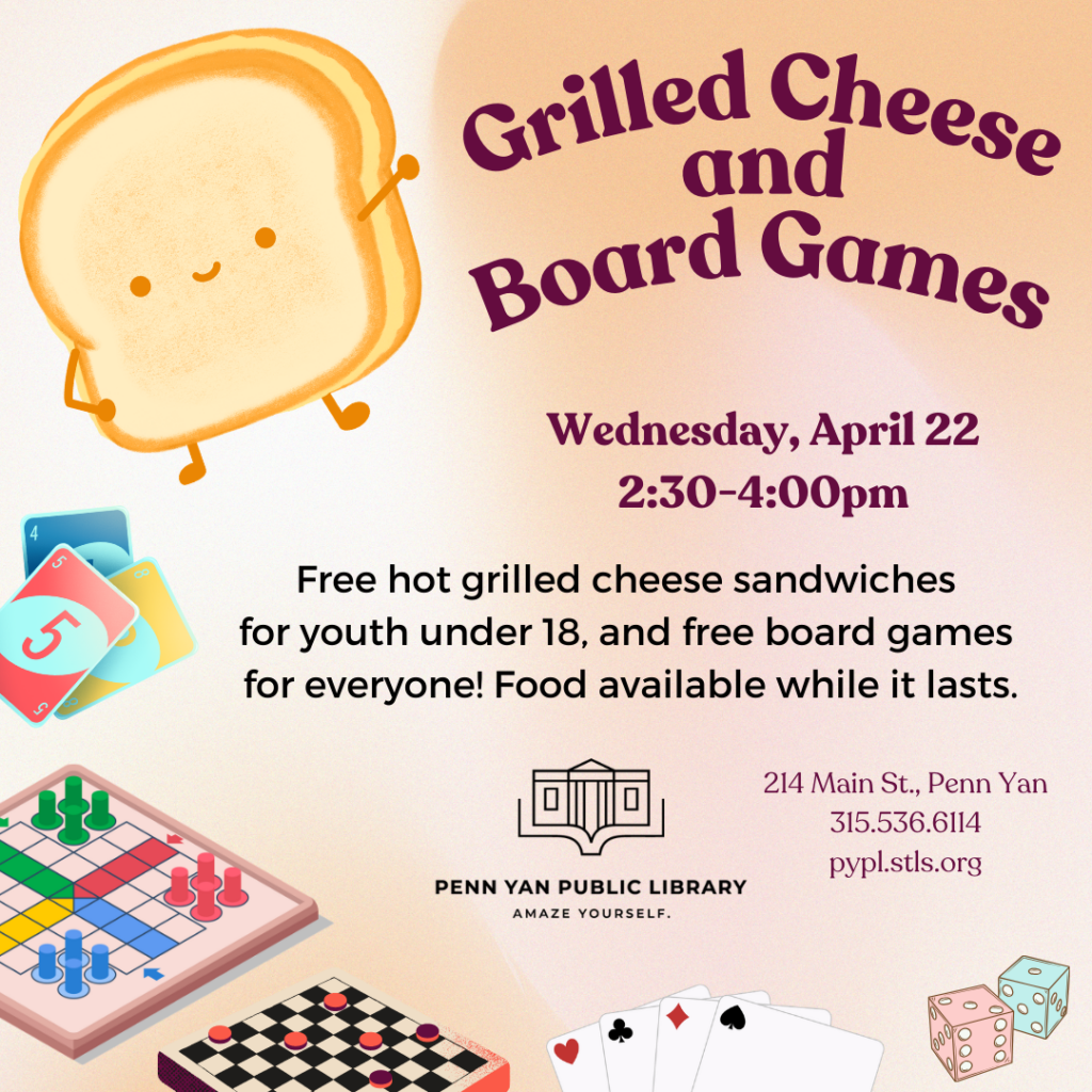 Free hot grilled cheese sandwiches for youth ages 10 to 18, and free board games for everyone! Food available while it lasts.
