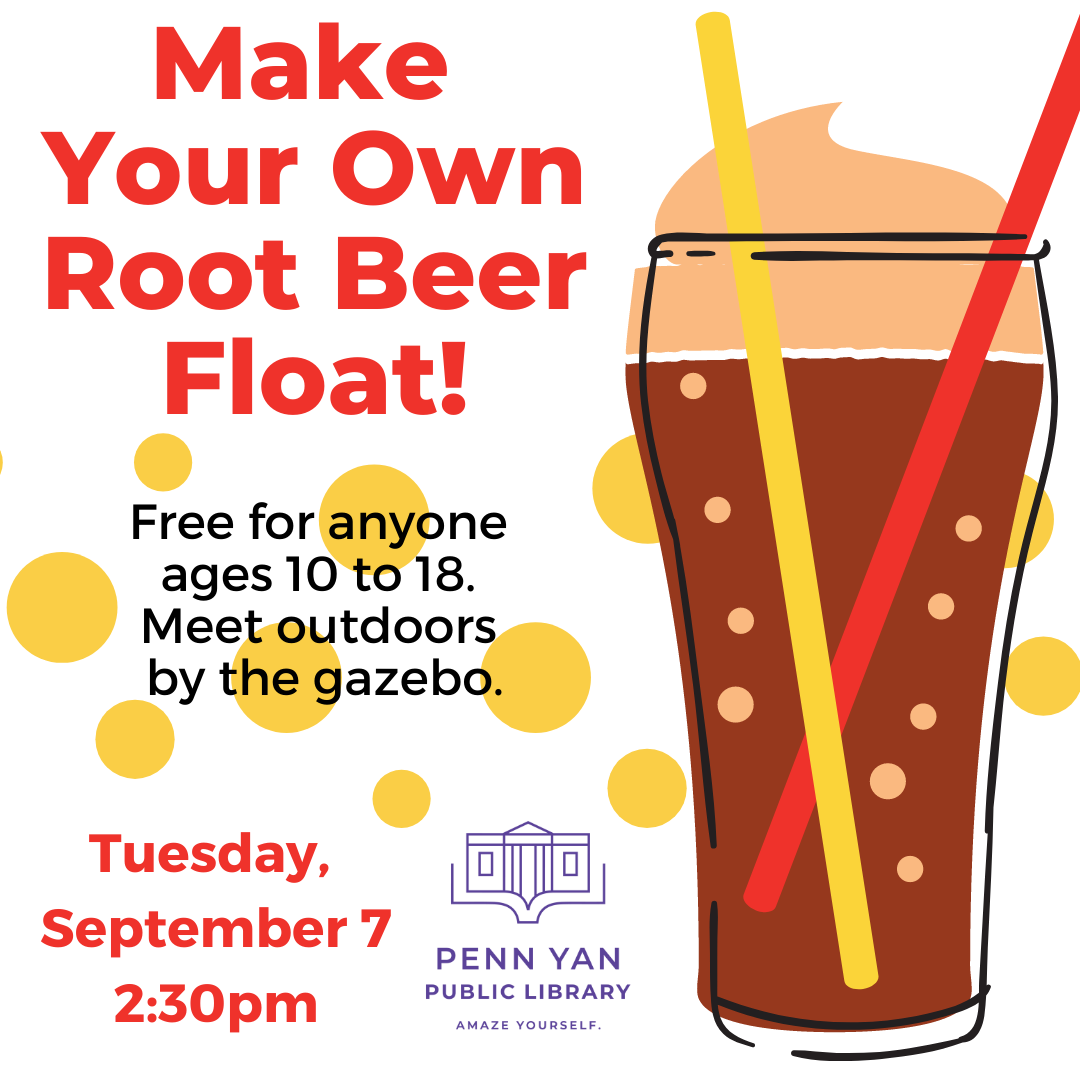 It’s pretty simple: make your own root beer float! Free for anyone ages 10 to 18 while supplies last. Meet outdoors by the gazebo at the library, 214 Main St. in Penn Yan.