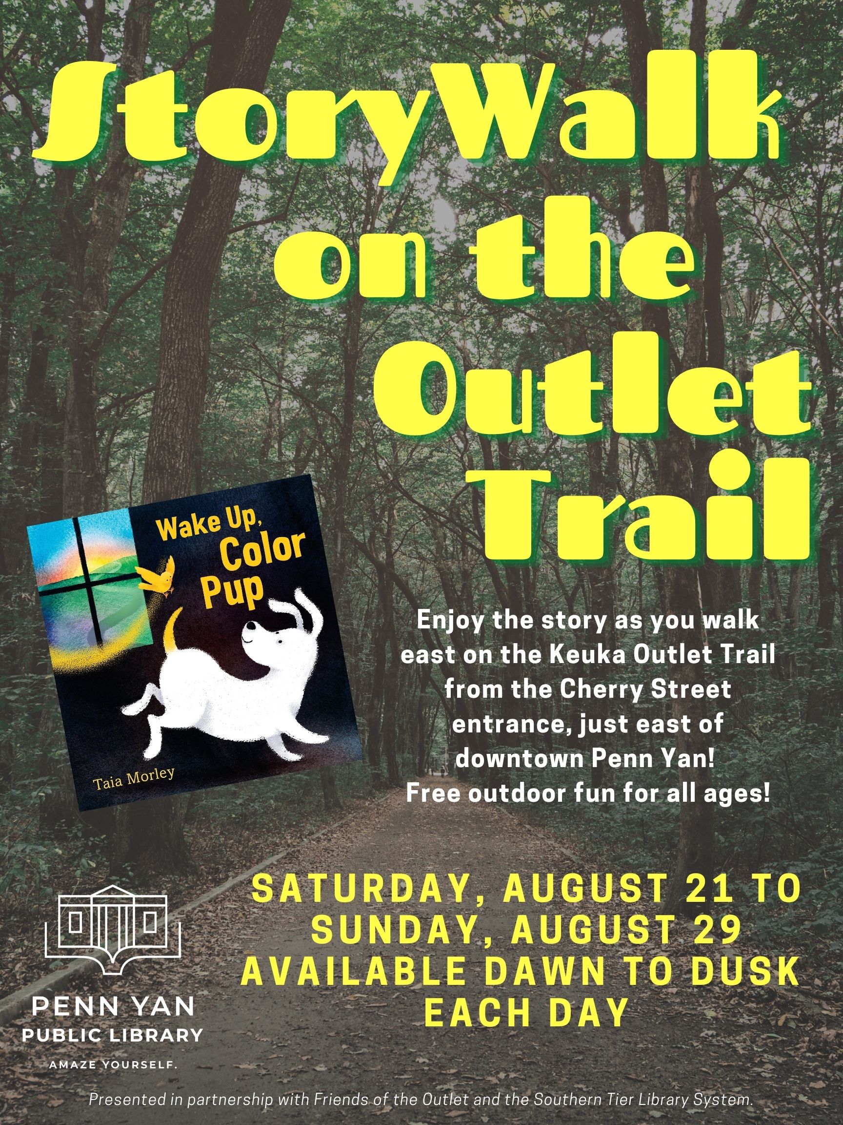 Walk and read on the Keuka Outlet Trail! Beginning at the Cherry St. entrance of the trail, walk east to read the story “Wake Up, Color Pup” which has been mounted on election-style signs. Bring the whole family and walk whenever suits your schedule! Brought to you by Penn Yan Public Library in partnership with the Southern Tier Library System and the Friends of the Outlet. The trail is unpaved and level, but be sure to dress for the weather!